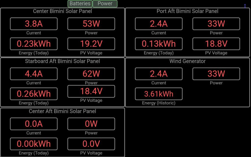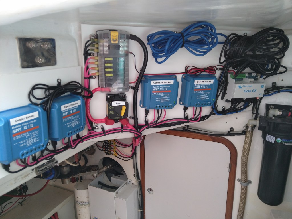 One of our biggest and most recent accomplishments on the boat was installing the system for solar power. This involved a lot of Lisa’s background knowledge and interest in electrical work and electronics to build a system of controllers and wires and connections to the panels and installing them in our “garage”. Who knew we would have a garage on a boat. This is really the work room which is most needed if you work on a boat and have All Of The Tools. I have never seen so many tools. Lisa also developed a great display on her phone and computer to be able to monitor the solar and battery power. The idea for the future is that Lisa will develop a program to make the display accessible to me on my BrailleSense notetaker.