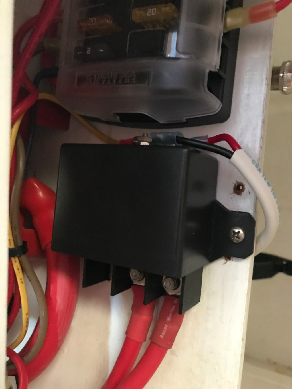 A battery combiner is pretty simple electrically and can be thought of as a relay which shorts two battery banks together if the voltage on the source battery bank is above a preset charging voltage. On a cruising sailboat all the charging sources such as solar, wind, engine alternator, and generator could charge the house bank and the combiner would tie the two banks together whenever things were being charged and break them apart when they weren’t. The engine battery would go along for the ride when solar kicked in in the morning, but would be isolated as the house bank was depleted, making sure it has the energy required to start the engine. Cool right?