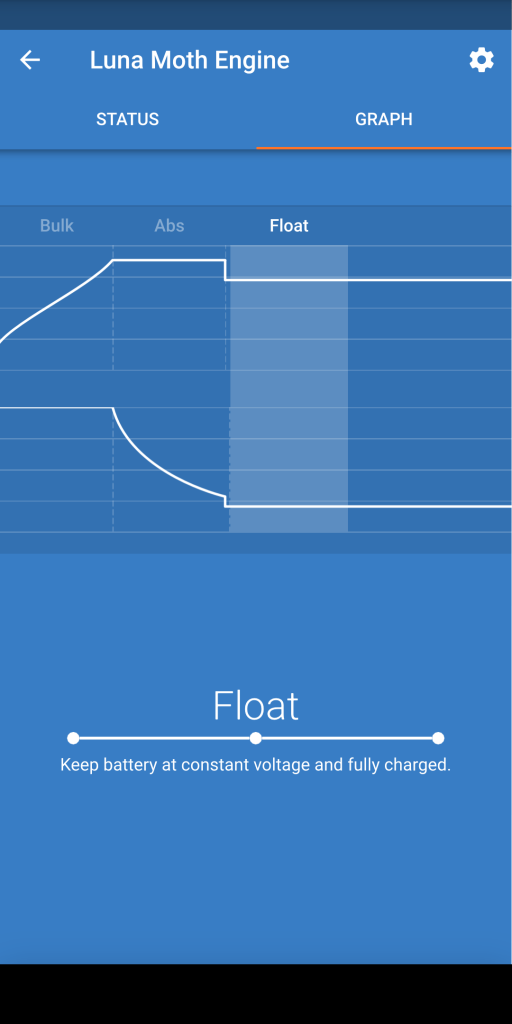 Our solution to protect the life of the new battery was to rip out the boat’s battery combiner and install a Victron Orion DC-to-DC charger. While battery combiners are rather simple, the Orion is a microprocessor controlled power supply that lets you configure the input voltage level to start or stop charging and a charge curve for the engine battery which is completely independent of whatever is going on in the house bank. As our house bank voltage drops after dark, our starter battery happily remains at its float voltage. As the sun comes up and the house bank goes into bulk charging, our engine battery remains at float, avoiding being overcharged and potentially off gassing.